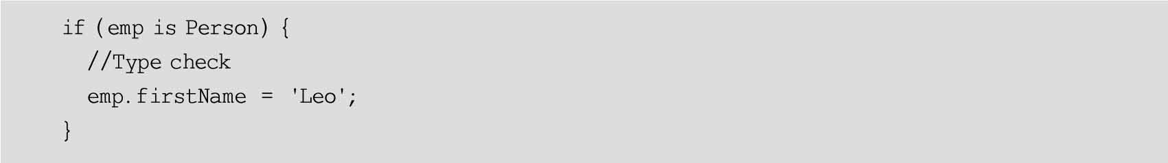 as、is和is!操作符在运行时用于检查类型非常方便。使用as操作符可以把一个对象转换为特定类型。一般来讲,如果在is测试之后还有一些关于对象的表达式,则可以把as当作is测试的一种简写,代码如下: