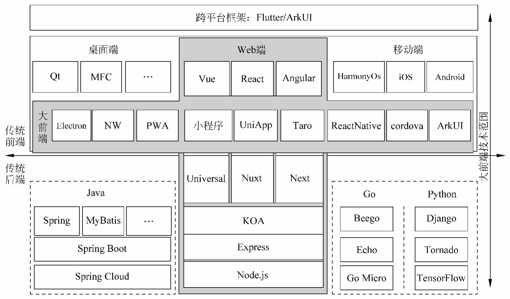而狭义的“大前端”是从全栈(传统前端+传统后端)的角度定义的,指从传统前端延伸到传统后端领域的整个全栈范围,如图1-2所示。