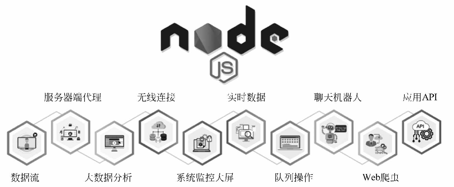 如今,Node.js广泛地应用于许多企业级的应用场景中,图1-3中列出了Node.js的使用场景,其中包括数据流、服务器端代理、大数据分析、无线连接、云平台、实时数据、消息队列、聊天机器人、Web爬虫和应用API等领域。