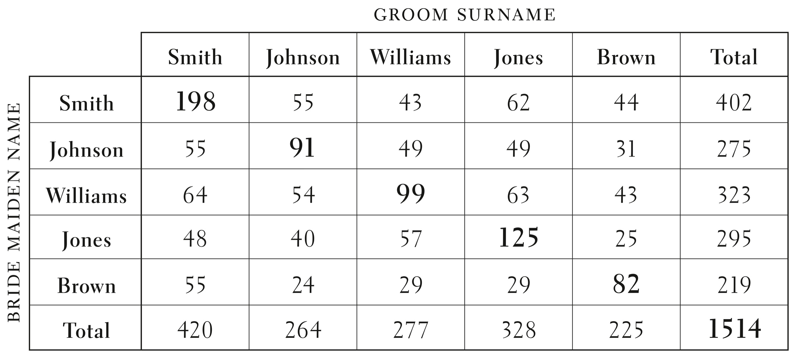 Listed along the horizontal and vertical axes are the five most common U.S. sur names. The numbers in the table represent how many marriages occurred between a bride and a groom with the corresponding names. Note that the largest numbers, by far, occur along the diagonal—that is, Smiths marry other Smiths three to five times as often as they marry Johnsons, Williamses, Joneses, or Browns. In fact, Smiths marry other Smiths about as often as they marry people with all those other names, combined. And the Johnsons, Williamses, Joneses, and Browns behave similarly. What makes the effect even more striking is that these are the raw numbers—that is, since there are almost twice as many Smiths as Browns, if all else were equal, you’d expect Browns to marry the ubiquitous Smiths far more often than the rarer Browns—but even so, by far the greatest number of marriages among Browns is to other Browns.