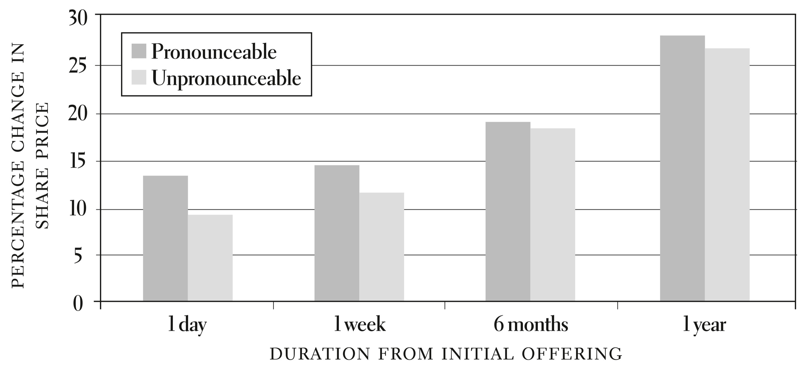Think about a firm preparing for an initial public offering (IPO). Its leaders will make a pitch regarding the company’s wonderful future prospects, and they will back up that pitch with data. But privately held companies are usually far less familiar to prospective investors than companies that are already on the exchange, and since the newcomers have no long public track record, there is even more guessing than usual involved in this type of investment. To see whether savvy Wall Street traders making real investments are unconsciously prejudiced against companies with hard-to-pronounce names, researchers turned to data concerning actual IPOs. As the graph below indicates, they found that investors were indeed more likely to invest in the initial public offerings of companies whose name or ticker symbols were easy to pronounce than in companies with complicated names or symbols. Notice how the effect fades over time, which is to be expected, because with time firms develop both a track record and a reputation. (In case the effect also applies to books and authors, please take note of how easy it is to pronounce my name: Ma-lah-DI-nov.)