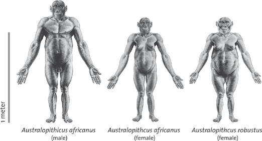 Instead of focusing on the names and dates of these species, let’s consider what they were generally like as well as some of the variations they reveal. If you could observe a group of them, your first impression might be that they were upright apes. In terms of size, they were more like chimpanzees than humans: females averaged 1.1 meters in height (3 feet 7 inches) and weighed between 28 and 35 kilograms (62 to 77 pounds), while males averaged 1.4 meters in height (4 feet 7 inches) and weighed between 40 and 50 kilograms (88 to 100 pounds). 3 Lucy, for example, was just under 65 pounds (29 kilograms), but a partially complete skeleton of a male from the same species (nicknamed Kadanuumuu, which means “big man”) weighed about 55 kilograms (121 pounds). 4 This means that male australopiths were about 50 percent larger than females, a size difference typical of species such as gorillas or baboons, in which males regularly fight with one another for access to females. Australopith heads were also generally apelike, with small brains only just a little larger than a chimpanzee’s, and they retained long snouts and large browridges. Like chimps, their legs were relatively short and their arms were relatively long, but their toes and fingers were neither as long and curved as a chimp’s nor as short and straight as a human’s. Their arms and shoulders were powerful, well suited to climbing in trees. Finally, if you could be like Jane Goodall and observe them for years, you’d discover that the australopiths had an apelike rate of growth and reproduction: they took about twelve years to grow into adulthood and females probably had offspring every five to six years. 5