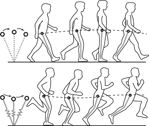FIGURE 7. Walking and running. In walking, the leg functions during the stance like an upside-down pendulum, elevating the center of mass (circle) in the first half of the stance before it falls in the second half. In running, the leg acts more like a spring, stretching as the center of mass falls in the first half of the stance and then recoiling to help push the body up in the second half of the stance and then into a jump.