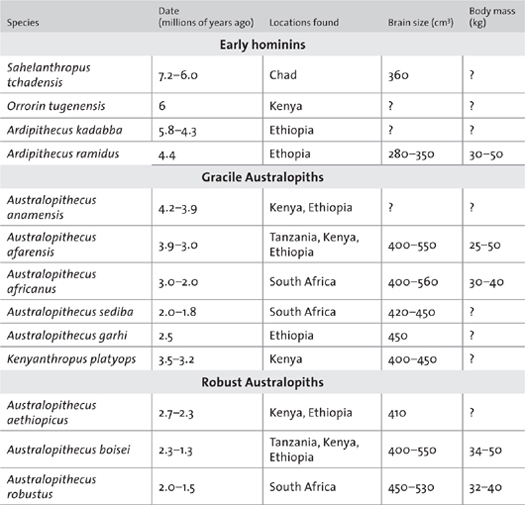 The australopiths lived in Africa between about 4 and 1 million years ago, and we know much about them thanks to a rich fossil record of their remains. The most famous fossil of all is, of course, the glam girl herself, Lucy, a diminutive female who lived in Ethiopia 3.2 million years ago. Unfortunately for her (but luckily for us), Lucy died in a marsh, which quickly covered her up, preserving slightly more than a third of her skeleton. Lucy is just one among many hundreds of fossils belonging to a species known as Australopithecus afarensis , which lived in eastern Africa between 4 and 3 million years ago. Au. afarensis , in turn, is just one of more than half a dozen different species of australopiths. Unlike today, when there is only one living species of hominin, Homo sapiens , there used to be several species living at any one time, and the australopiths were an especially diverse bunch. In order to give you a quick who’s who of these relatives, I’ve summarized their basic details in table 1 . Keep in mind that some of these species are known from just a few fossil specimens, so paleontologists do not entirely agree on how to define them. Because of uncertainties and the differences among the species, a good way to make sense of the various australopiths is to divide them into two general groups: the smaller-toothed graciles and the bigger-toothed robusts. The best-known species of gracile australopiths are Au. afarensis (of Lucy fame), which comes from eastern Africa, and Au. africanus and Au. sediba , which come from southern Africa. The best-known robust australopiths are Au. boisei and Au. robustus , from eastern and southern Africa respectively. Figure 5 illustrates what a few of these species might have looked like.