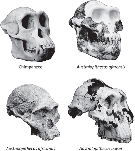 FIGURE 6. Comparison of a chimpanzee skull with three species of australopiths. Australopithecus afarensis and Australopithecus africanus are both considered more gracile, while Australopithecus boisei is more robust, with bigger teeth, larger chewing muscles, and a larger face.