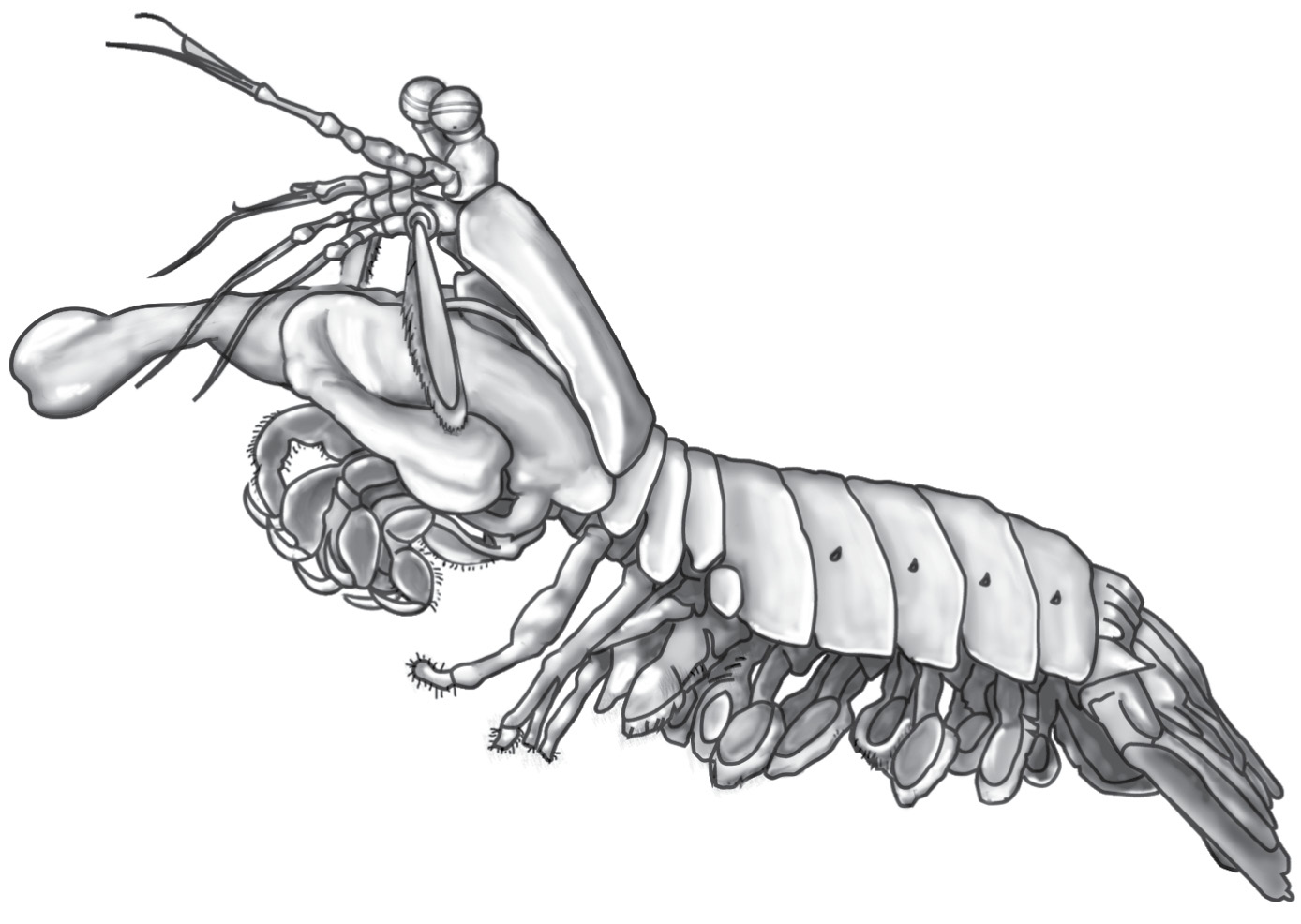 This punching power serves another purpose. Mantis shrimp live on shallow reefs, where they are vulnerable to moray eels, octopi, sharks, and other predators. To stay safe, they spend much of their time holed up in cavities in the reef, with just their powerful foreclaws exposed. But suitable cavities are in short supply, and this can lead to fights. When an intruder approaches a smaller resident, the resident typically flees. But if the resident is big enough, it waves its claws in a fierce display, demonstrating its size and challenging its opponent.