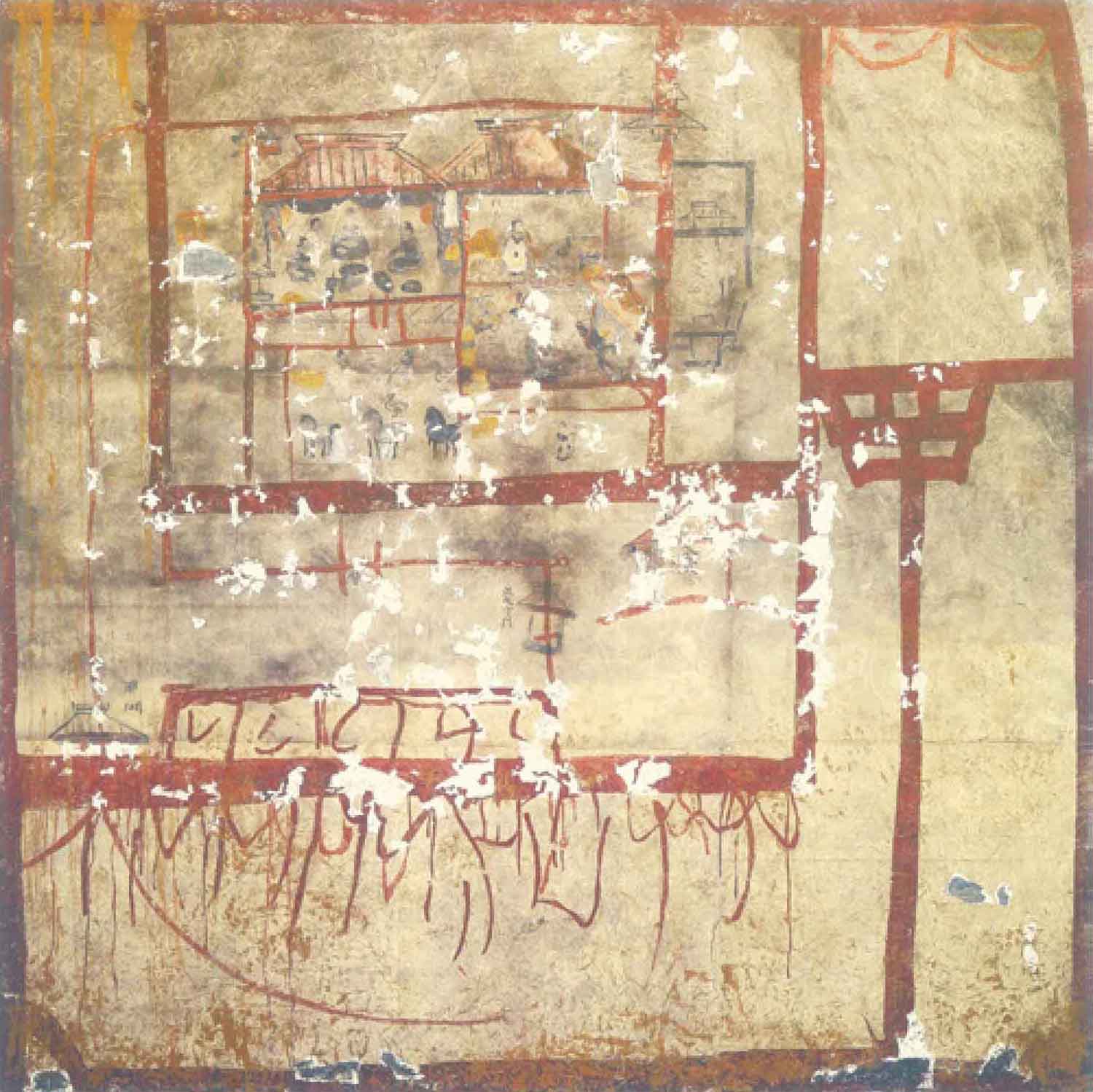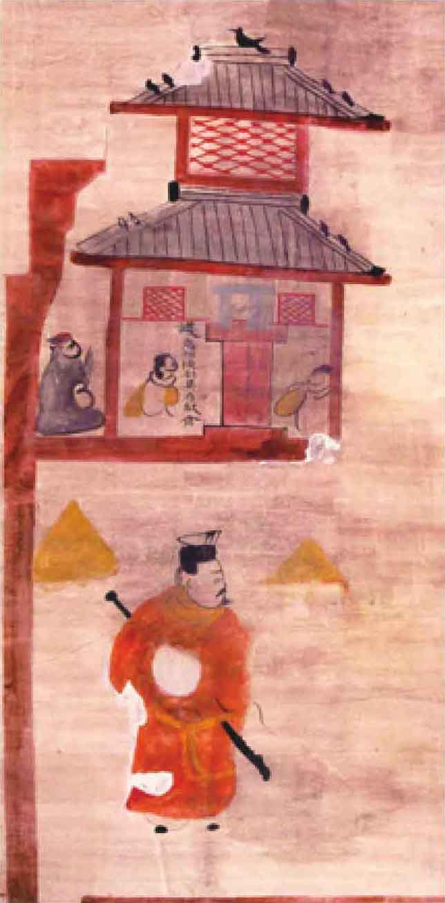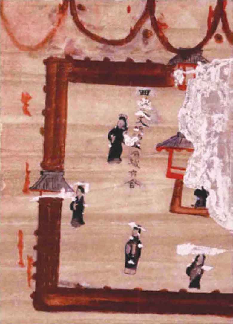 在中室南壁甬道西侧壁画中,离石是一座只有单层城墙的小小城池,其中一屋即为府舍,或许是因刚经历战乱,府舍也便因陋就简了。(图12)