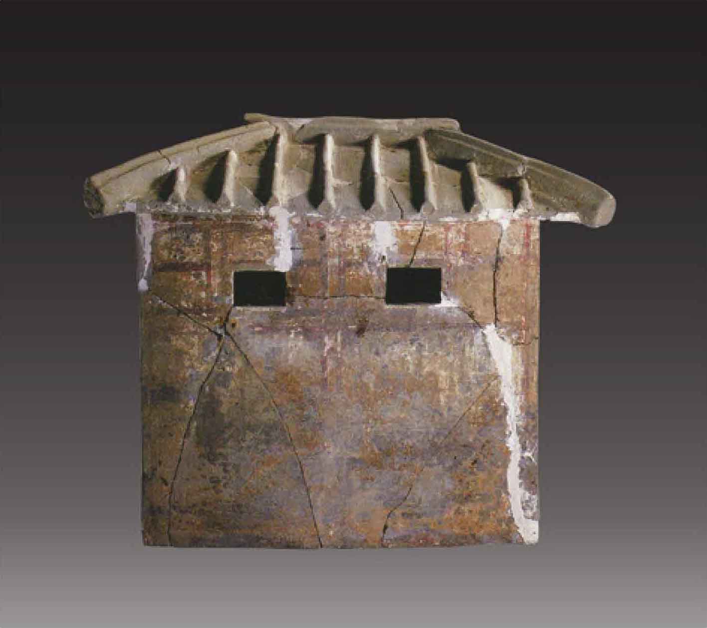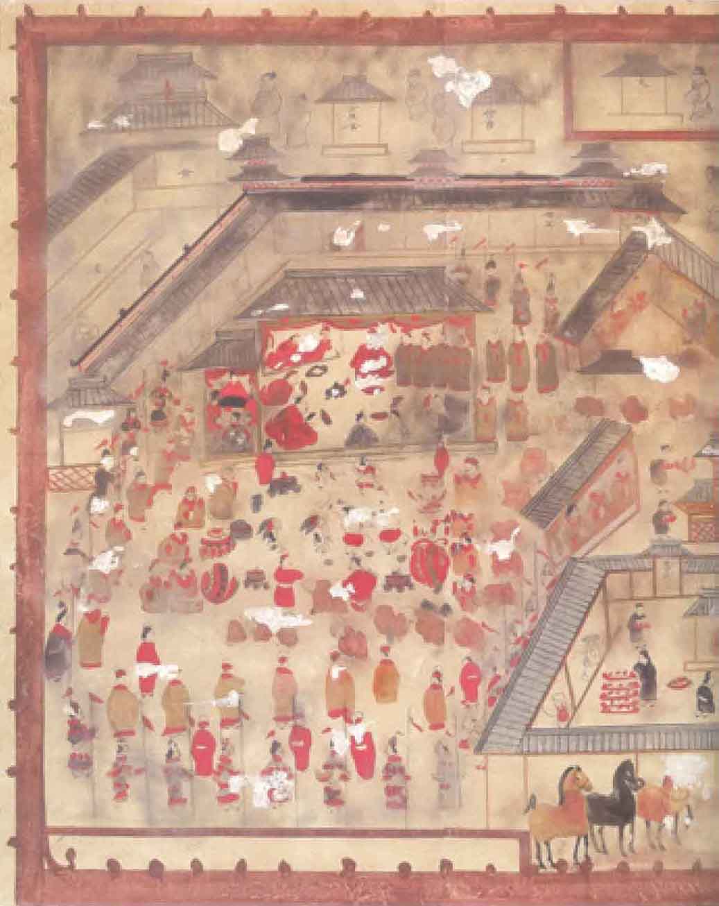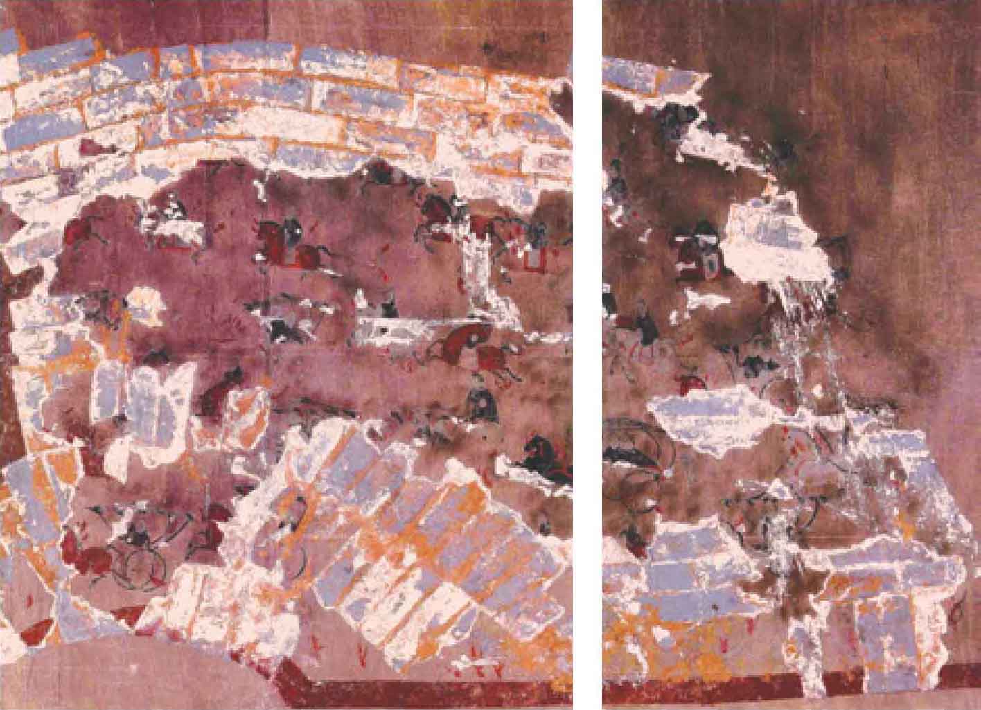 在中室南壁甬道西侧壁画中,离石是一座只有单层城墙的小小城池,其中一屋即为府舍,或许是因刚经历战乱,府舍也便因陋就简了。(图12)