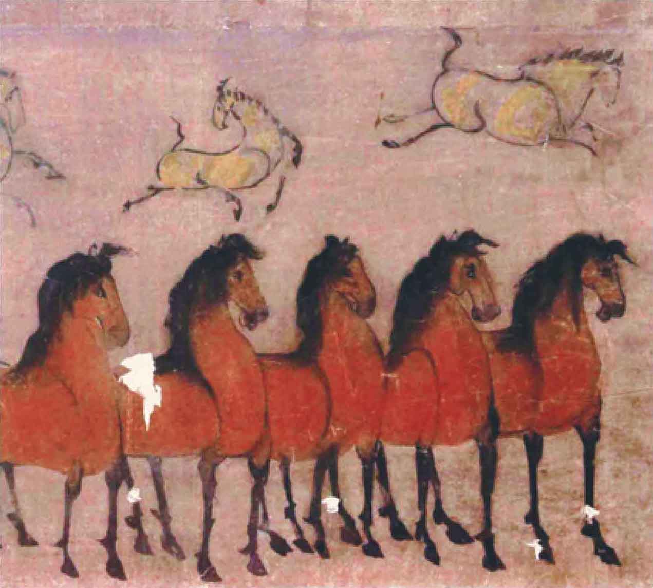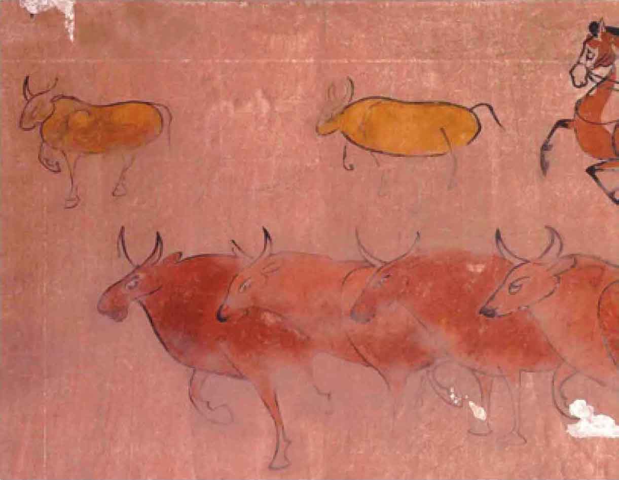 墓室壁画展示了李汉拥有的丰饶田产,农业是其庄园的主要生产方式。在平整的田地间,农夫驱使着两头牛合力拉犁(图2),这种“二牛抬杠”的耕作法正是中原所流行的。此外,壁画还描绘了采桑、沤麻等农作场景。(图3)种粟麦以为食,治丝麻以为衣,显然庄园里因循着汉地的衣食习惯。然牧业亦不可少,厩中牛羊肥壮,骏马成群。(图4、图5、图6)可知,作为汉帝国的北疆边地,这里是一片宜农亦牧的乐土。
