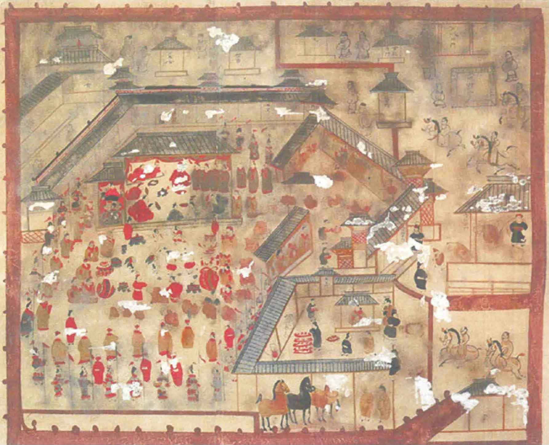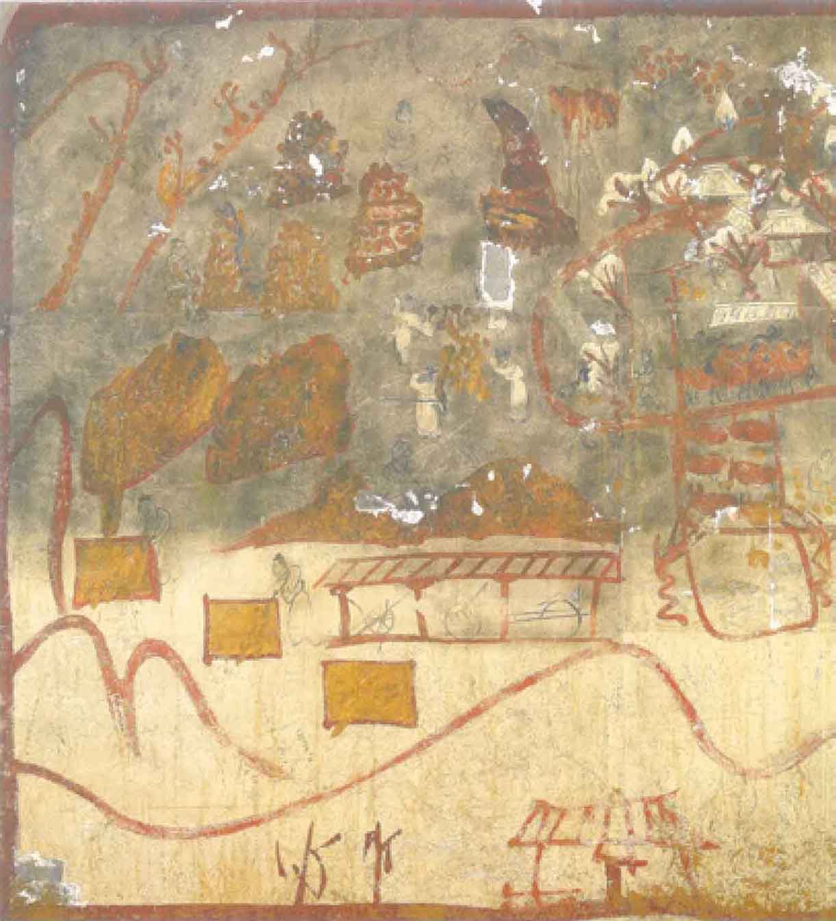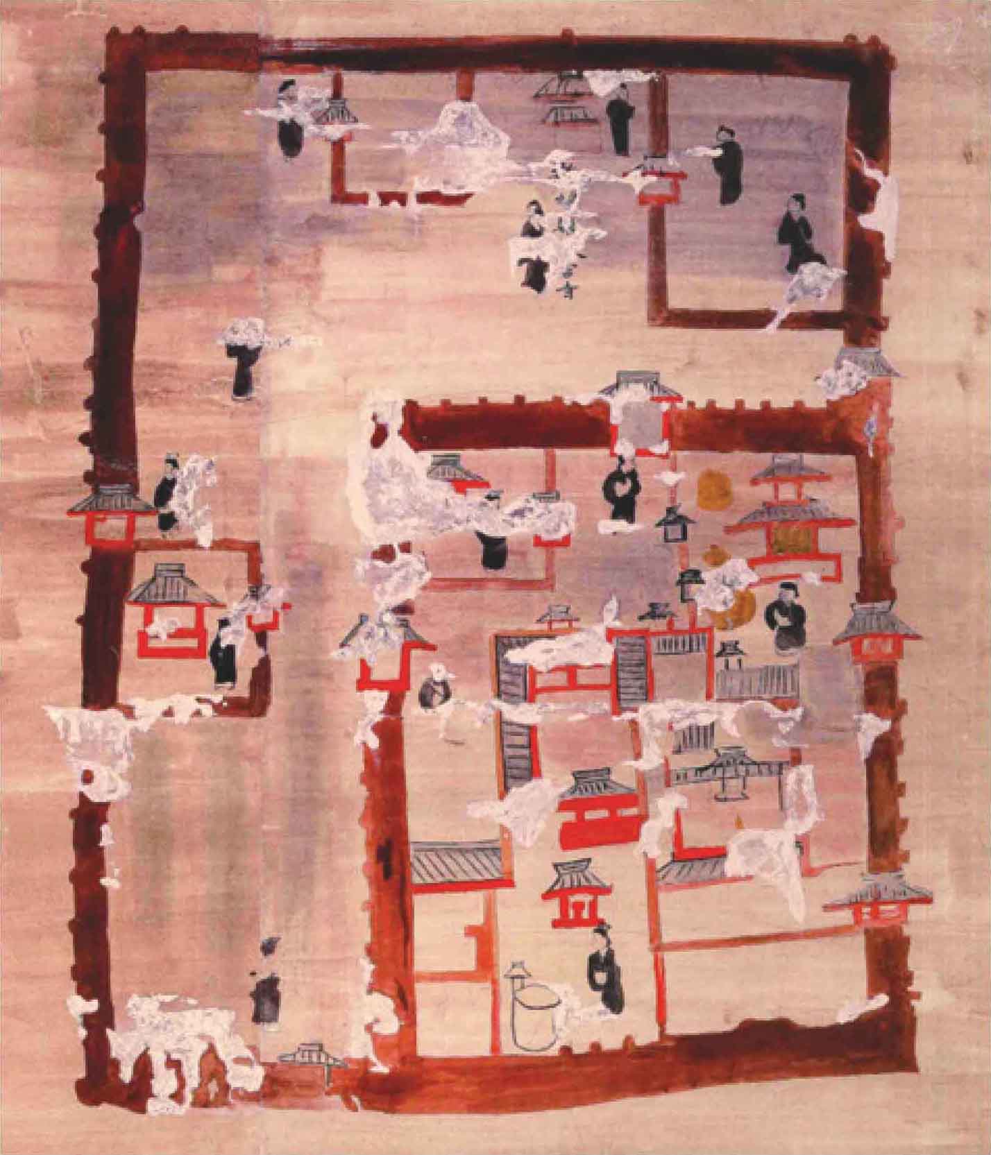 作为中原大县,中室南壁甬道东侧壁画中的繁阳县城格局远胜过边地的离石、土军。县城为双重墙垣的城池,外城城墙高筑,有四座城门,其一隅,又起内城,内城亦有带雉堞的城墙和城门,内外城中,还有坊墙,将城市划分为不同用途的区域,“繁阳县令官寺”即为其一。城中屋舍严整,次第分布,可知这是一座繁华的大城。(图18)