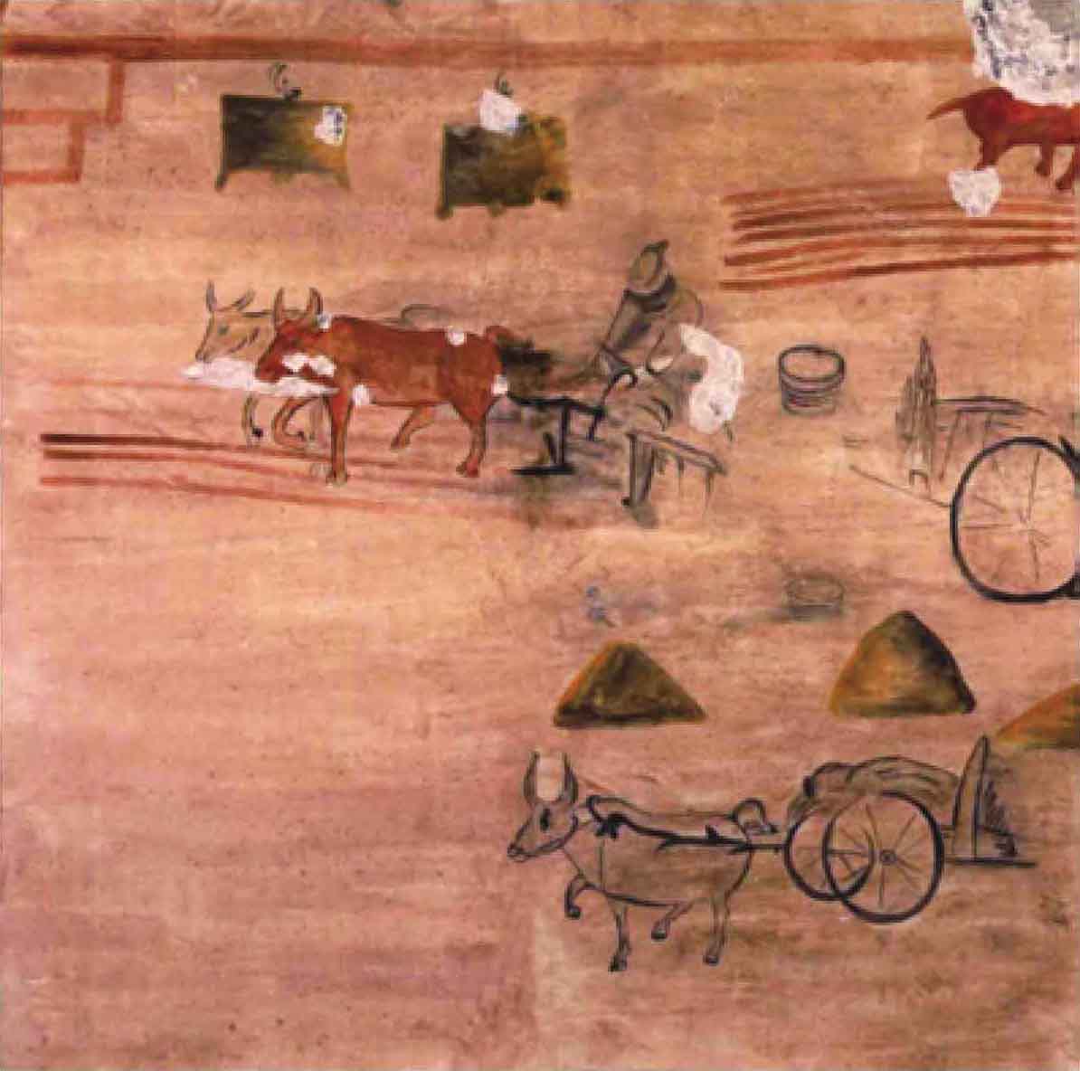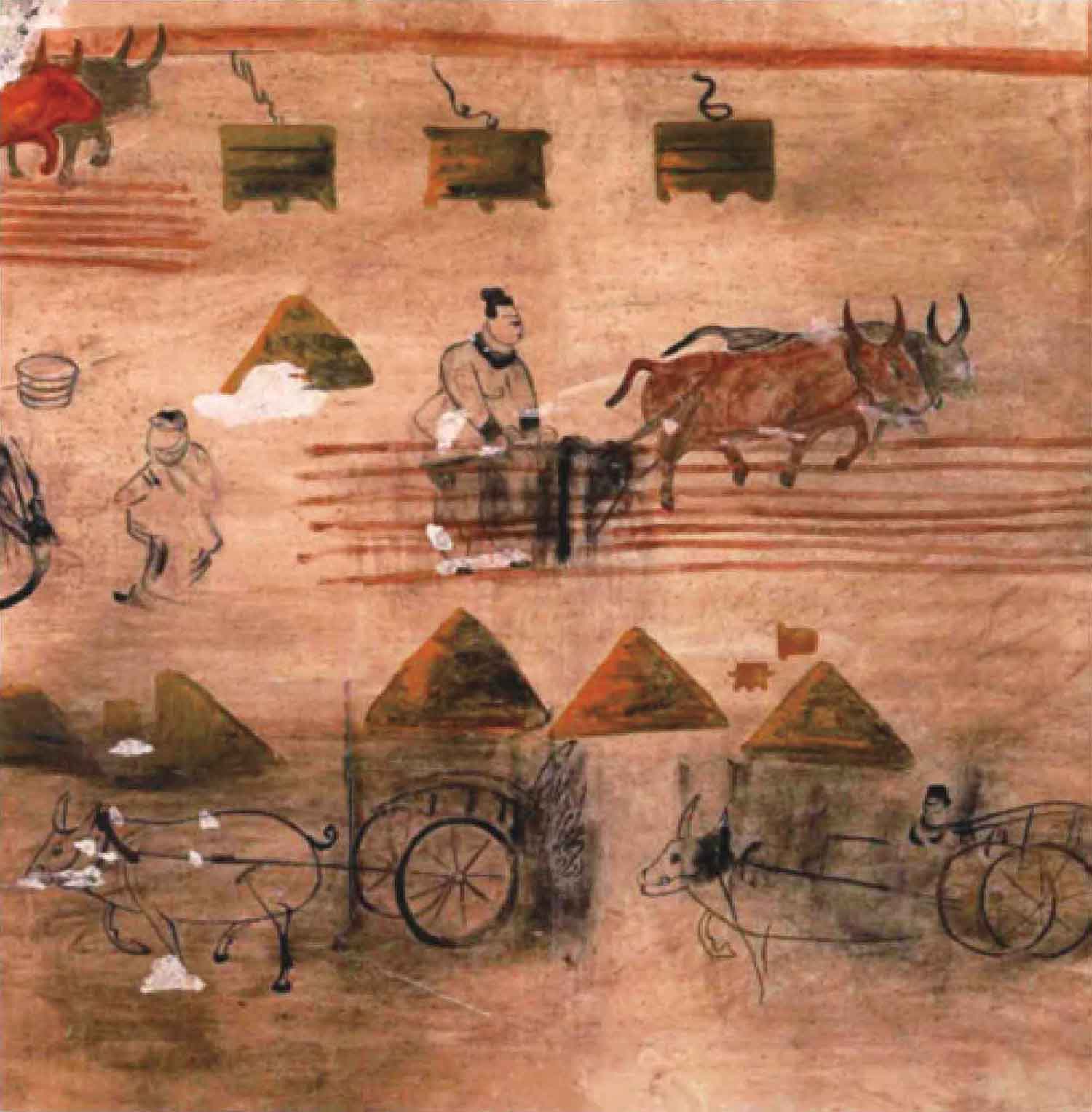 李汉在繁阳为官时,必定目睹了这种设计精巧的耕作方式。恰好,在墓室壁画的农耕图中,有一人扶犁二牛耕作的场景,画中的平行横线可能就是相间的甽畮。(图20)可以猜想,李汉或许将中原的农耕法带到了遥远北地,在自己的庄园中施行。
