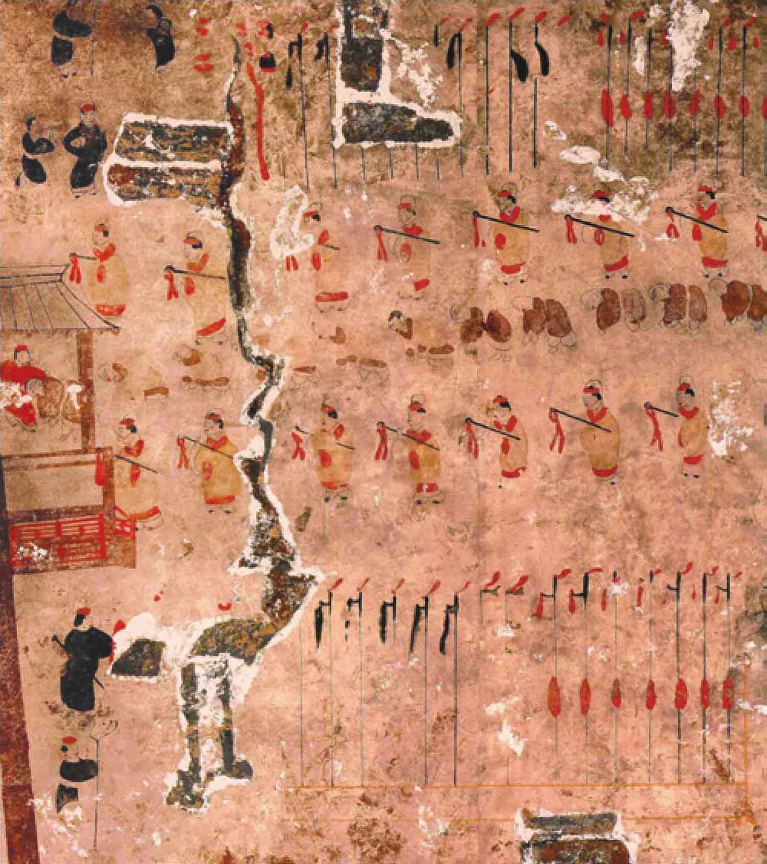 ,身着赭缘黄衣或赭衣。而两侧陈列着兵栏,矛戟林立,众多甲士武弁或持矛,或持刀,寒光闪耀,展示着汉军的强大实力,令这些向来桀骜的乌桓、鲜卑人也不禁俯首躬身,在官吏的审视下,进了宁城南门。(图24)