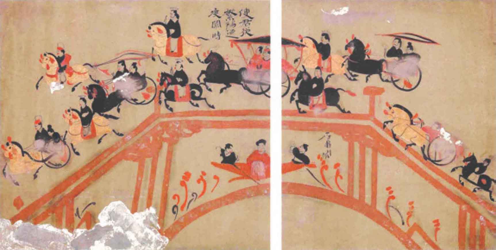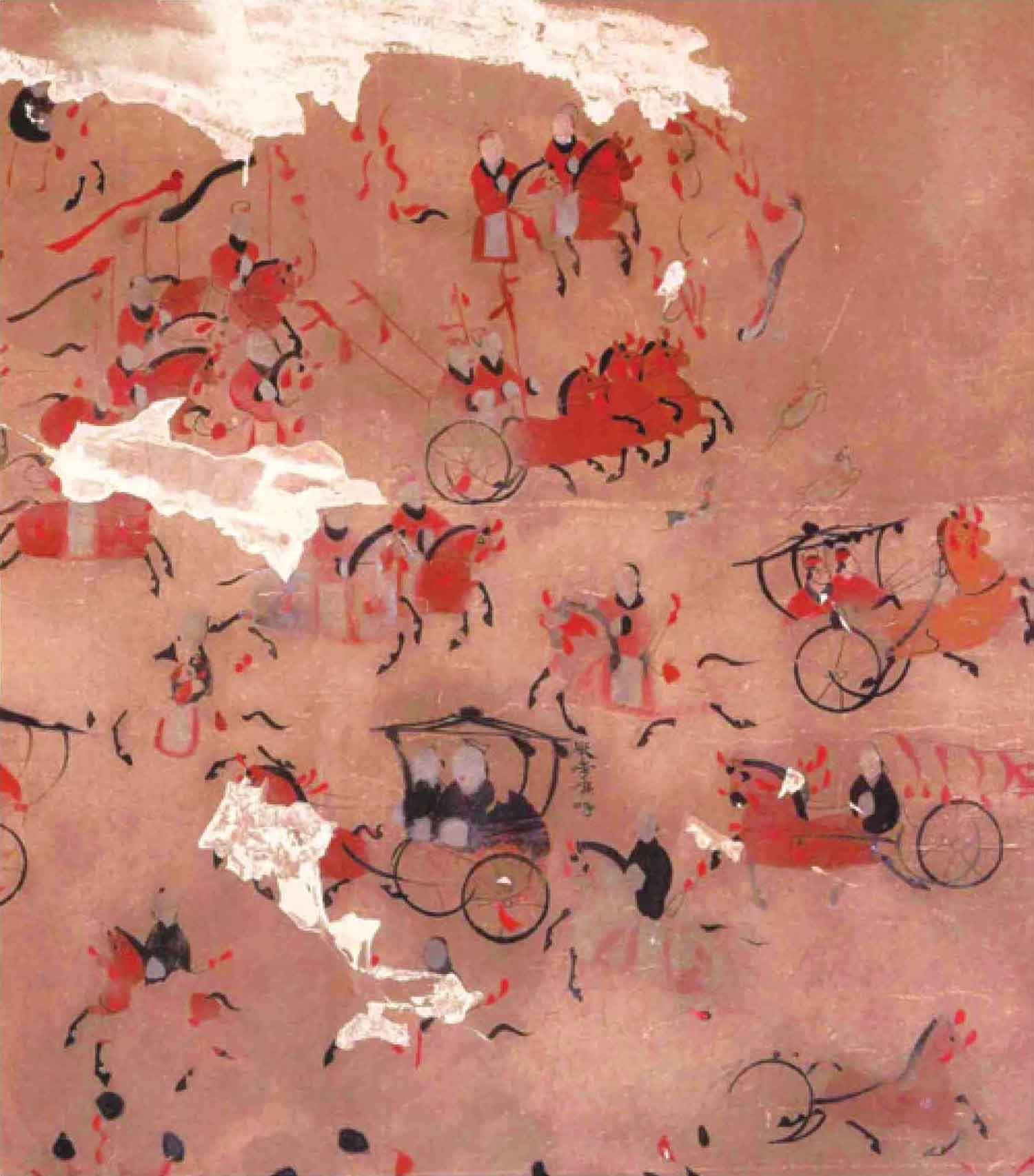非同一般首先体现在出行阵容上。出行图壁画局部破损,画里虽人马不全,但目前可见的128个人物、129匹马、11辆车仍然显示出护乌桓校尉出行的喧阗气势。