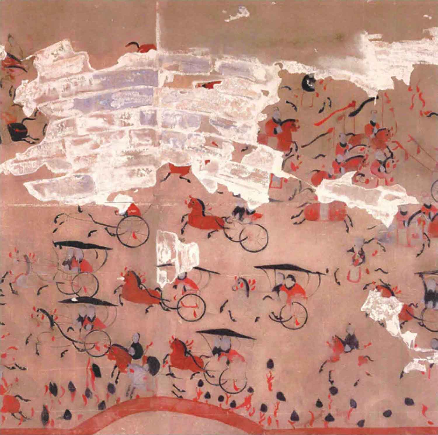 以六百石代理比二千石的要职,这是对李汉能力的充分肯定。由此,行上郡属国都尉出行在壁画中被表现得十分隆重。李汉端坐主车中,前方有持红缨棨戟的甲士开道,前后皆有副车护卫,数十武士簇拥,一行车马浩浩荡荡。(图13)
