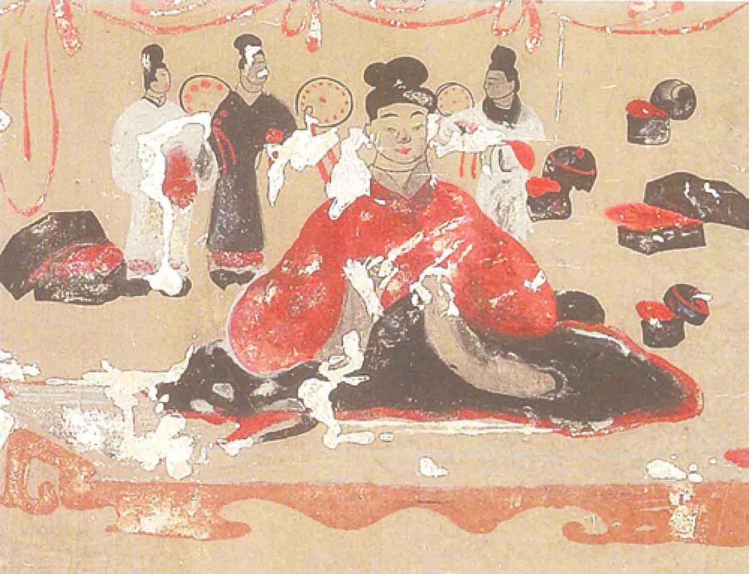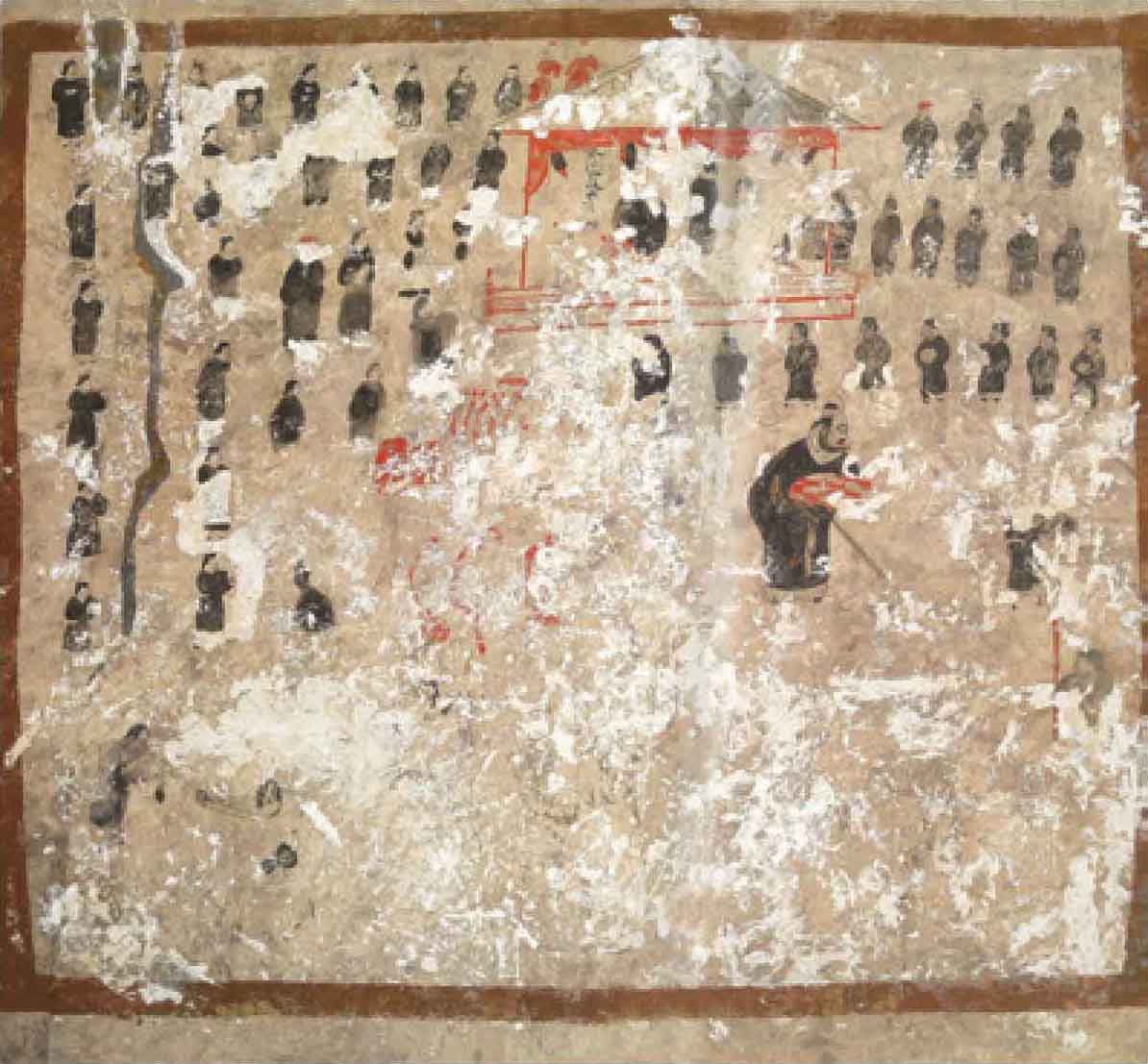 前室与中室间甬道南壁壁画描述了当时的场景:繁阳县令官寺的院子里,站满了属吏们,他们态度庄严,共同见证这难得一见的仪式。天子的使臣宣读了皇帝褒奖李汉的圣旨后,李汉叩谢皇恩,接受了玺书。