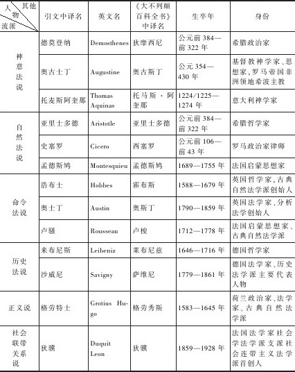 诸如希腊之德莫登纳(Demosthenes)、罗马之神父奥古士丁(Saint Augustine)及托麦斯阿奎纳士(Thomas Aquinas)等,认法律为神所启示,基于神之意思而制定,称为神意法说。希腊之亚里士多德(Aristotle)与罗马之史塞罗(Cicero)及法国之孟德斯鸠(、ontes-quieu)等等,认法律乃应乎人类之自然,为人类之理性,称为自然法说。英国之浩布士(Hobbes)及奥士丁(Austin)等等,认法律是统治者之命令,法国之卢骚(Rousseau)认为法律为主权者之命令,称为命令法说。德国之来布尼斯(Leibniz)及沙威尼(Saviqny)等等,认法律为民族历史之产物,称为历史法说。荷兰之格劳特士(Grotius)认法律为人类所遵循之正义,称为正义法说。法国之狄骥(Leon Duquit)认法律为社会联带关系之常轨,称为社会联带关系法说。此外,更有认法律为国家所制定,法律为统治者之支配工具者。前者称为国家制定法说,后者称统治者法说。