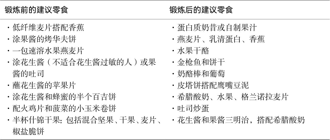 在表1-3中,里斯针对锻炼前后通常应该吃什么零食提出了建议。请你在尝试后找到最适合自己的食物和进食的时间。