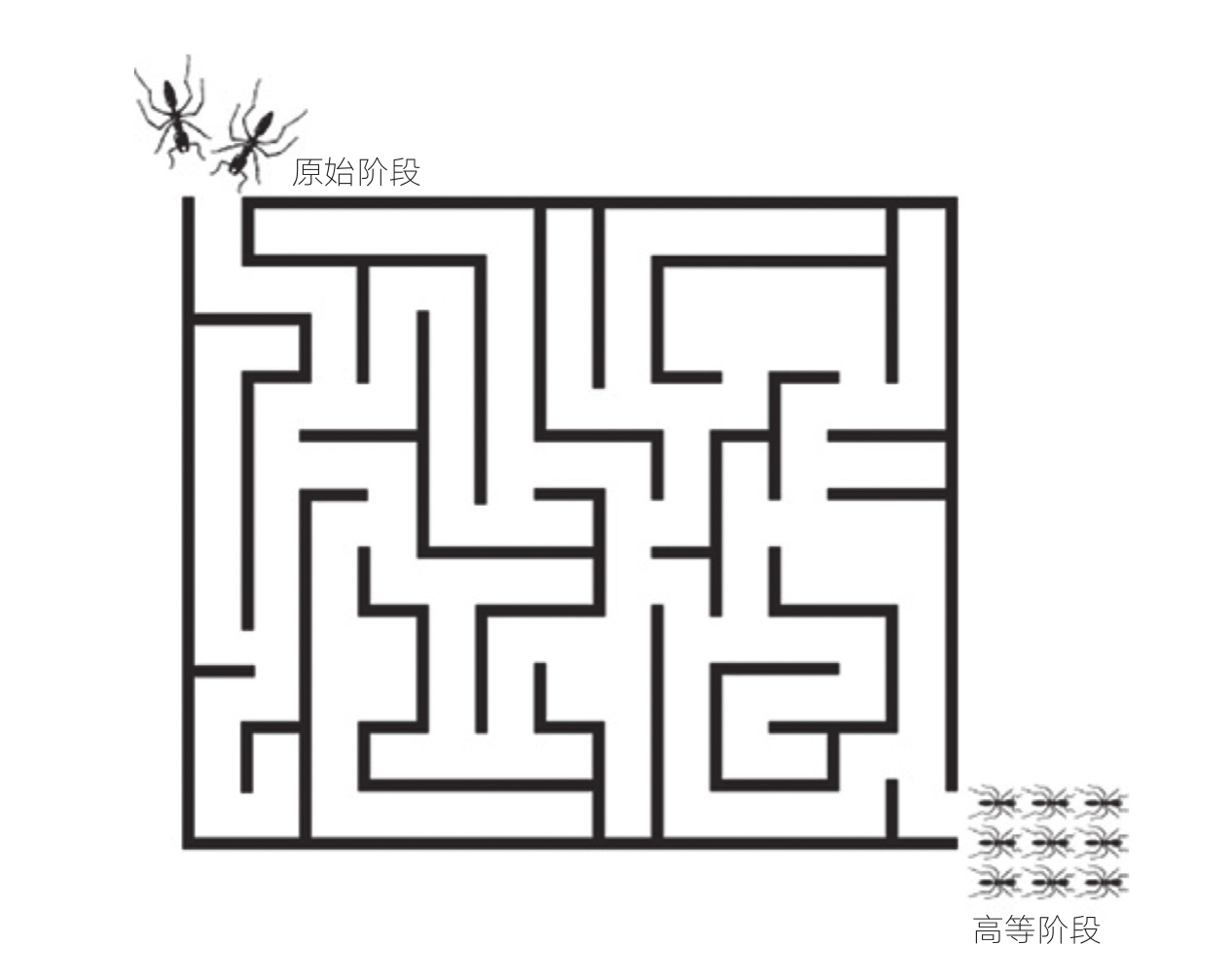 我们可以用走迷宫的方式来说明一个物种可能经历的演化路径(见图3-1)。在实现一个重大进展的过程中,比如真社会性的产生,每一次遗传变化就相当于迷宫中的一个转角,要么使得达成这一进展的可能性更低甚至使之成为不可能,要么离这一进展更近一步。最开始的几步,也就是仍然存在一些其他选项的情况下,要走通迷宫还有很长的路,离终点也远得很,完成的可能性非常低。到最后几步,距离终点已经不远,成功的可能性就变得大多了。在这一过程中,迷宫本身也受到演化的控制。旧通道(生态位)会关闭,新通道会打开。迷宫结构在某种程度上依赖于迷宫里面穿行的每一个物种。
