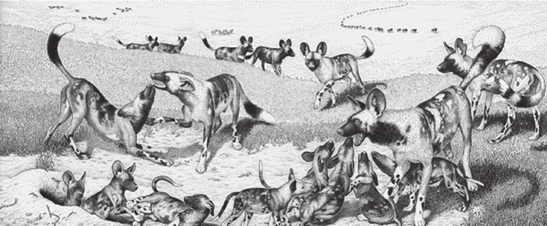 晚成鸟,即雏鸟无独立生活能力需要亲鸟喂养的鸟类,也有类似的预适应。少数几种鸟中,刚成年的小鸟会在巢中停留一段时间,帮助亲鸟一起照顾弟弟妹妹。但没有任何鸟类继续演化出完善的真社会性。它们有的只是喙和爪子,从未具备使用更复杂的工具的能力,也完全不曾掌握火的用法。狼和非洲野犬像黑猩猩、倭黑猩猩一样合作狩猎(见图3-7)。非洲野犬也会挖洞,可供一到两头雌性伴侣生下一大窝幼崽。犬类中有的成员会出去狩猎并把一部分猎物带回巢穴给母狗和小狗吃,其他成员则留守看家。这种引人瞩目的犬类,尽管获得了罕见且极其不容易的预适应,也仍未能达到真正的真社会性、具备专职工犬或猿类的智力。它们没有能力制造工具,缺少适合抓握的爪与末端柔软的指头。它们依然四脚着地,依赖于裂齿和覆毛的爪子。