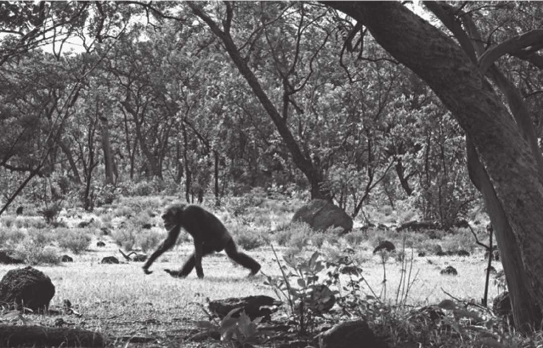 图3-2 一只黑猩猩两足行走在塞内加尔方戈里的稀树草原中