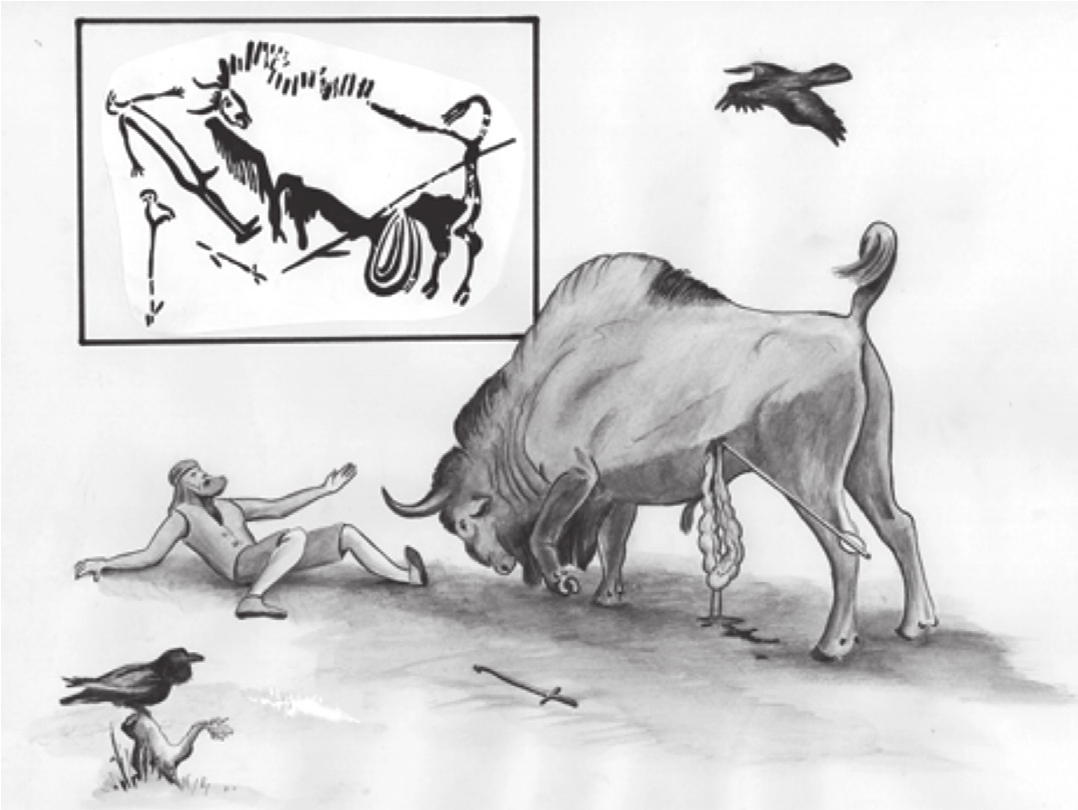 在史前时期,狩猎是一种具有高度适应性的、危险的行为。这幅插图是旧石器时代拉斯科洞穴壁画的一部分,描绘了一头中箭的野牛扑向一名倒下的猎人,而一只乌鸦(一种跟随猎人的常见食腐动物)在附近徘徊。图片来源:R. Dale Guthrie in The Nature of Paleolithic Art, Chicago: University of Chicago Press, 2005.