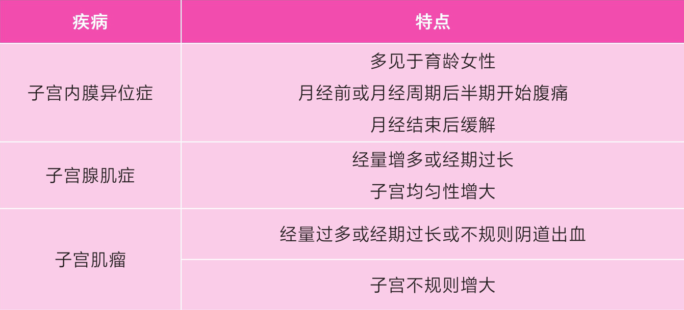 如表2所示,引发继发性痛经的常见疾病包含子宫内膜异位症和子宫腺肌症。子宫肌瘤也有可能引起痛经,比如,黏膜下肌瘤,就可能会引起痛经。