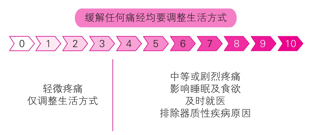 针对所有的痛经,我们首先要做的是调整生活方式。到中度以上、难以忍受的程度时,则需要排除器质性病变,并且采取适度的药物治疗。可以使用视觉模拟痛觉评分法进行评级自测,达到4级以上,即中、重度以上的痛经,就应该选择药物治疗了。当药物治疗仍然不能有效缓解痛经时,则需要考虑手术治疗。