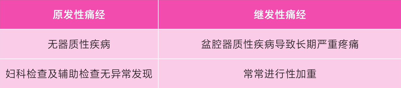 痛经在临床上分为两类:一类叫原发性痛经;另一类叫继发性痛经。两类痛经各自的特点如表1所示。