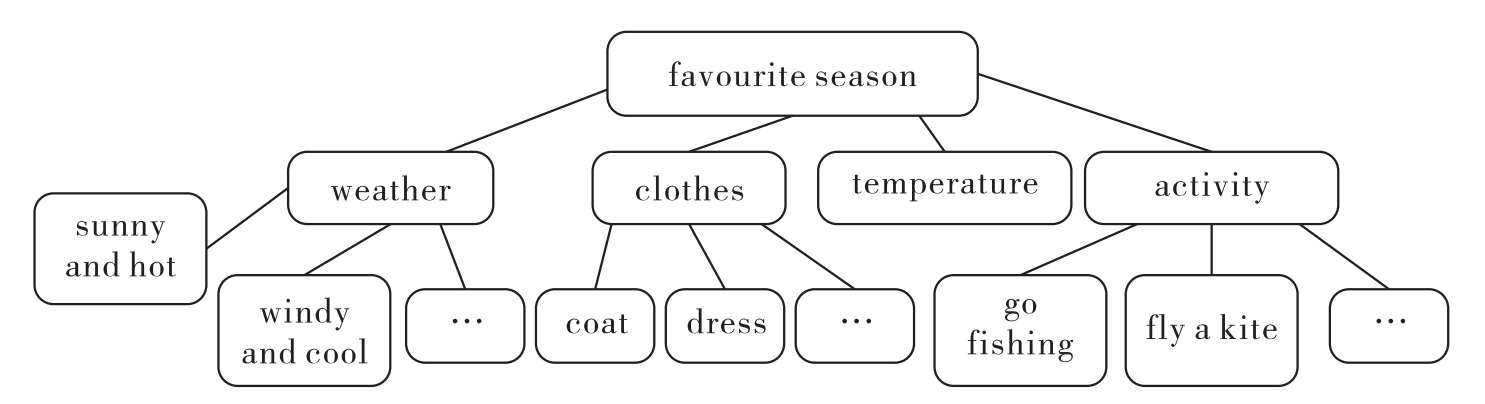 利用思维导图进行课程的教学设计,会促使师生形成整体观念和在头脑中创造全景图,帮助师生掌握正确有效的学习方法策略,更快、更有效地进行课本知识的传授,促进教学效率和质量的提高。根据学习策略指导性原则、目的性和针对性原则、复现性原则,笔者在五年级上册Module 6 “Weather”的复习课中,通过图1的思维导图复习跟天气有关联的语言知识,建立系统完整的知识框架体系,为引导学生的书面表达做铺垫。