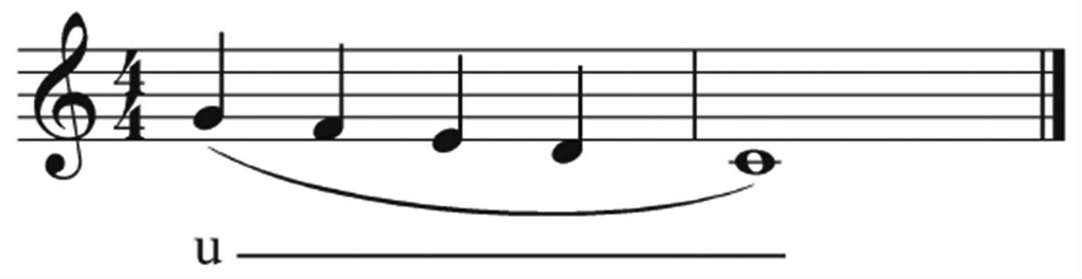 练习u元音时,首先要把第一个音咬住,随着音阶的下行将下颌逐渐打开,使喉结随之逐渐下移。这样按半音关系从上到下地反复练习这个五度下行的音阶片段,喉咽腔自然就打开了。