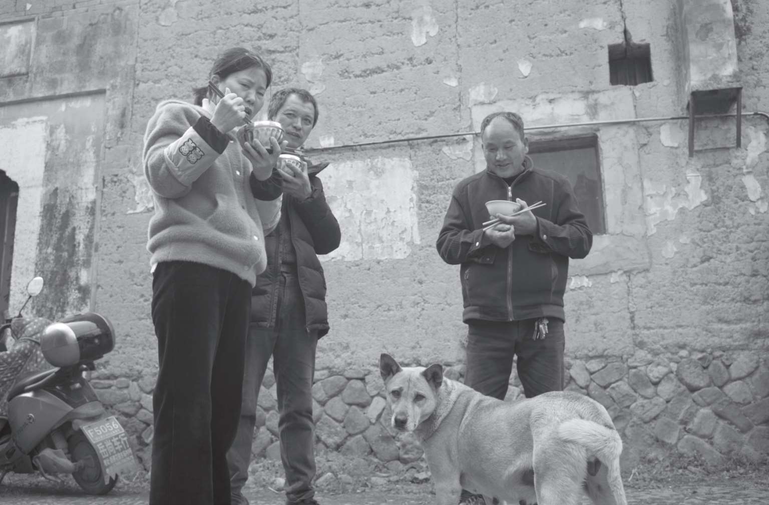 在他们吃饭的时候,一条大黄狗摇着尾巴跑过去讨吃的,村民们就从碗里挑几块骨头扔给它,人和狗都愉快地吃着。为了拍下全画面,我赶紧蹲下来放低视角,还不能对焦距,只能盲拍,为的是不打扰眼前的一幕。