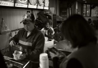 途经一家卖臭豆腐的小吃店,本来是冲着臭豆腐去的,但店里的一幕瞬间吸引了我。那是一对母女,母亲在前面忙碌,女儿应该是刚放学回来,她在小桌上摆好书包和作业本,在嘈杂声中,在妈妈忙碌的背影后写起了作业。熟练的动作和神情让我心中一动——这便是她们的日常。