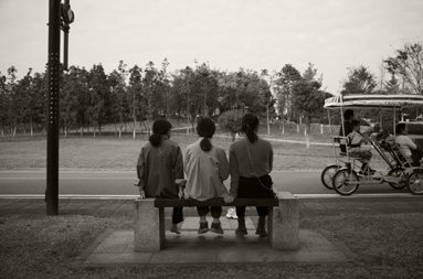 这般场景立刻让我想起了另一张闲适的背影图:三个中年女子并肩坐在公园的板凳上,她们身形相似,穿着朴素而干净,慢悠悠地交谈着,可能是太惬意了吧,其中一位甚至把鞋子脱了。