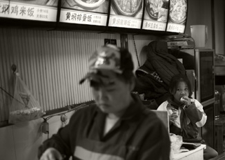 我猜他们是夫妻,肢体语言没有很亲密,表情有些许疲惫,也很放松——我希望他们是一家人。上了一天班,终于可以休息了,丈夫用虽然很小却能遮风挡雨的摩托车载着妻子,一起回家,一起吃饭。
