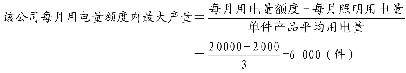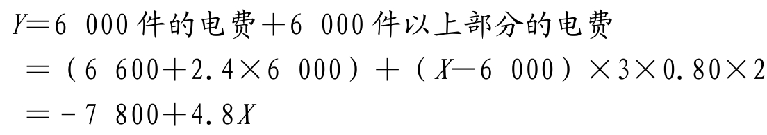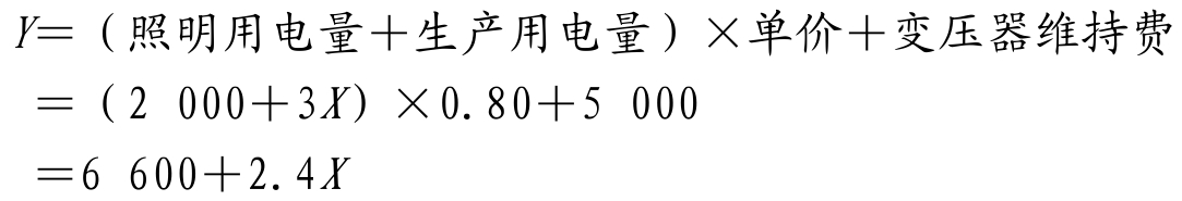 【实例2.10】 皖巢公司与某供电公司签订的供电合同中规定:该公司的变压器维持费每月为5 000元,每千瓦时电费0.80元,用电量额度每月20 000千瓦时,超额用电量按正常电费的2倍计价。已知该公司每件产品平均用电量3千瓦时,照明用电量平均每月2 000千瓦时。要求:采用契约检查法对混合成本电费进行习性分析。