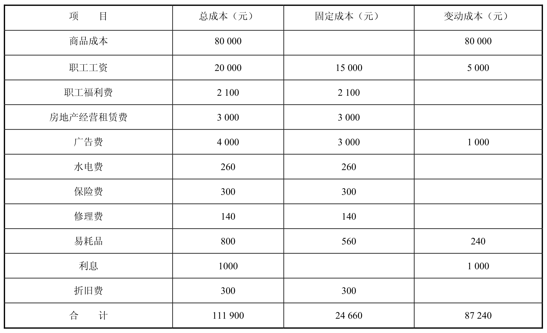 根据上述资料,对每个成本费用项目进行研究,根据固定成本和变动成本的定义及其特点,并结合该公司具体情况判断它们属于哪一类成本。经过研究分析,商品成本和利息与商店业务量关系密切,基本上属于变动成本;职工福利费、房地产经营租赁费、保险费、修理费、水电费和折旧费等基本上与业务量无关,可以作为固定成本。但是,职工工资、广告费和易耗品等与典型的两种成本性态差别较大,不能简单地归集为固定成本或变动成本,应当使用工业工程法、契约检查法或历史成本分析法寻找一个比例,将其分为固定成本和变动成本两部分。