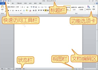 Word 2010的工作界面由快速访问工具栏、标题栏、功能选项卡和功能区、【帮助】按钮、文档编辑区、状态栏和视图栏等组成,如右图所示。