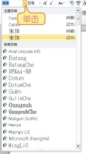 02 单击【开始】选项卡中的【字体】下拉列表框右边的下拉按钮,弹出【字体】下拉列表。