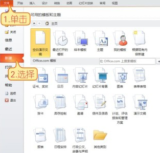 01 启动PowerPoint 2010软件,单击【文件】选项卡,在展开的面板中选择【新建】选项。