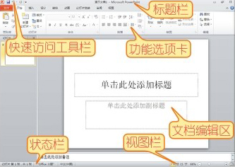 PowerPoint 2010的工作界面由快速访问工具栏、标题栏、功能选项卡和功能区、【帮助】按钮、文档编辑区、状态栏和视图栏等组成。