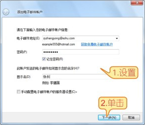 03 在【电子邮件地址】和【密码】栏中输入已有的邮箱账号和密码,在【显示名】处输入希望收件人收到邮件时看到的名字,再单击【下一步】按钮。