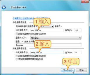 04 进入设置电子邮件服务器的页面,设置电子邮件服务器类型(默认为POP3),在【待收服务器信息】和【待发服务器信息】栏中输入POP3和SMTP服务器地址,再单击【下一步】按钮。