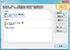 01 打开Windows Live Mail的【工具】菜单,选择【账户】命令,打开【账户】对话框,其中列出了目前已经添加的所有账户,单击【添加】按钮。