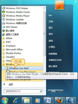 Windows 7在【开始】菜单中提供了Windows Live Mail的快捷方式。打开【开始】菜单,选择【所有程序】→【Windows Live】→【Windows Live Mail】命令,即可启动Windows Live Mail。