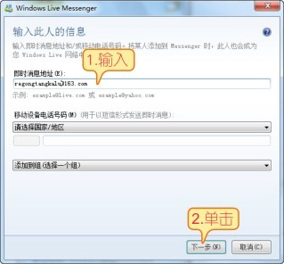 05 选择【添加联系人】命令,打开添加联系人的窗口,在【即时消息地址】文本框内输入联系人账号,单击【下一步】按钮。