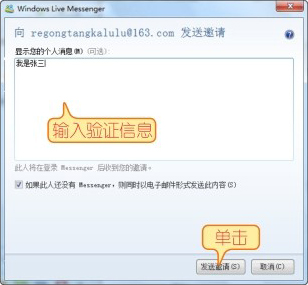 06 在【显示您的个人消息】文本框中输入验证信息,以便对方能够知道是谁要添加他为好友,然后单击【发送邀请】按钮。