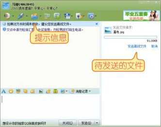 16 这时在消息窗口中出现等待对方的接收许可的提示。对方同意接收文件后,文件即开始在线传送,消息窗口的右侧会显示传送进度。