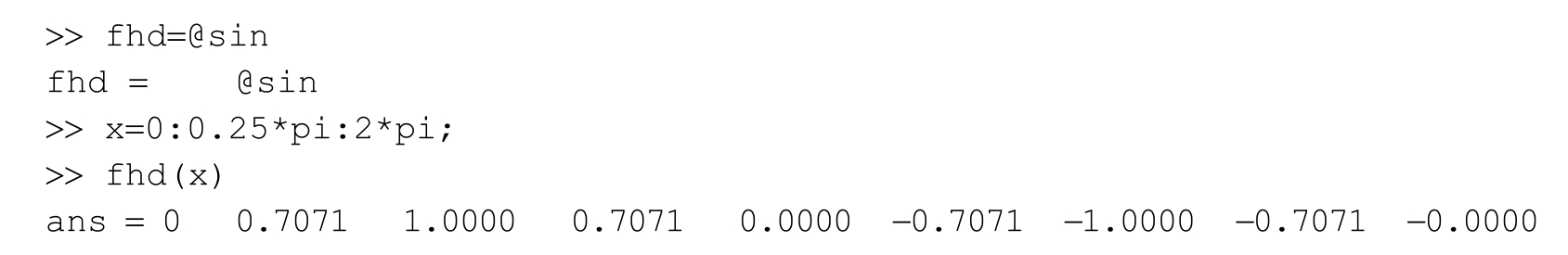 例如fhandle=@sin就创建了MATLAB内部函数sin的句柄,并将其保存在fhandle变量中,以后就可以通过fhandle(x)来实现sin(x)的功能。