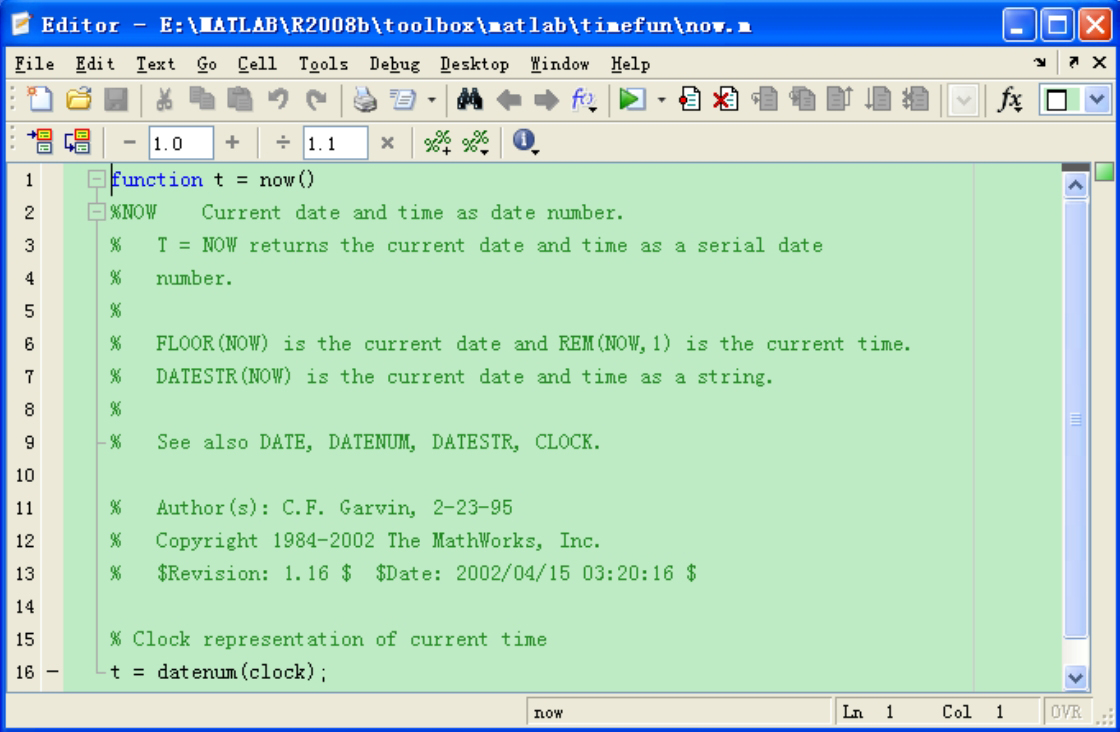 函数M文件的命名一般习惯和函数名一致,比如图4-2中函数声明行function T=now(),表明函数名为now,因此此函数M文件一般保存为now.m,可以通过now()语句调用该文件;否则,如果函数名和文件名不一致时,函数调用就需要通过文件名和与函数声明中对应的参数列表来实现。