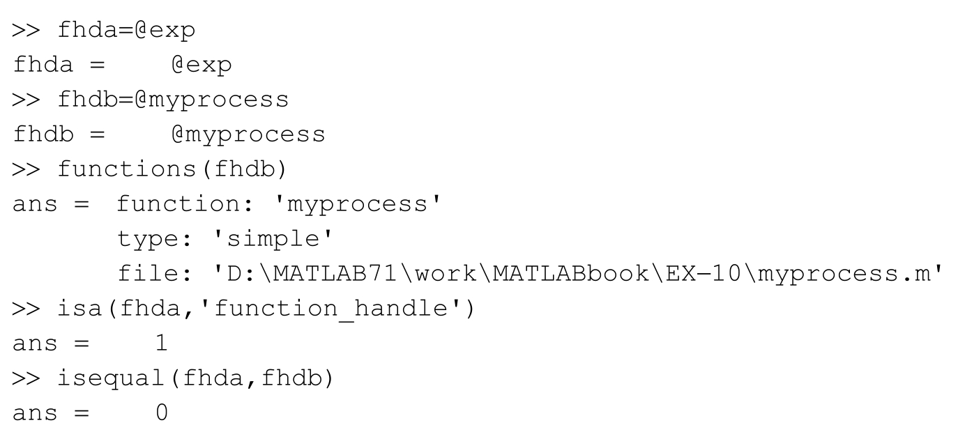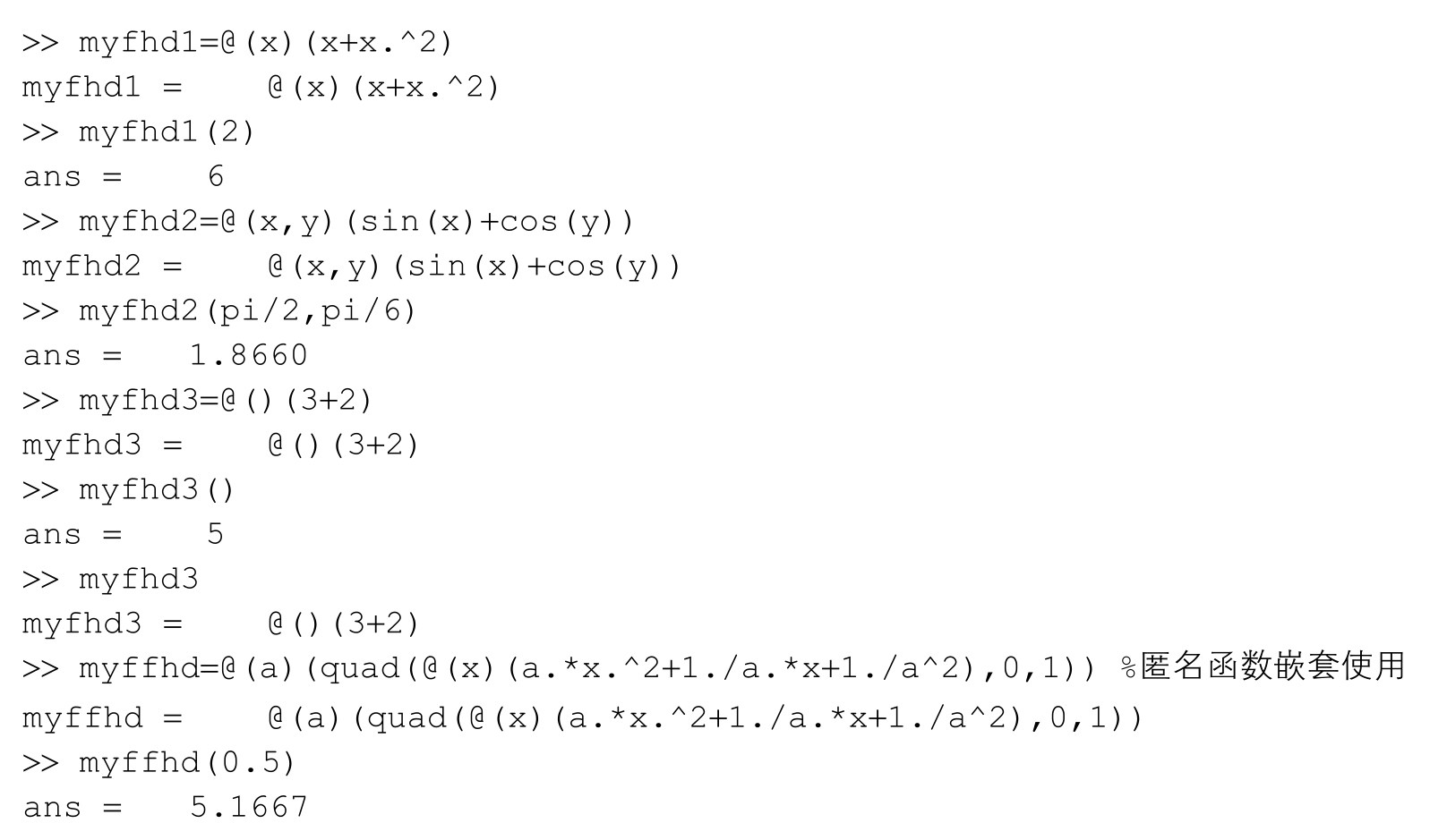 通过函数句柄调用函数时,也需要指定函数的输入参数,比如可以通过fhandle(arg1,arg2,...,argn)这样的调用格式来调用具有多个输入参数的函数。对于那些没有输入参数的函数,在使用句柄调用时,要在句柄变量后加上空的圆括号,即fhandle()。